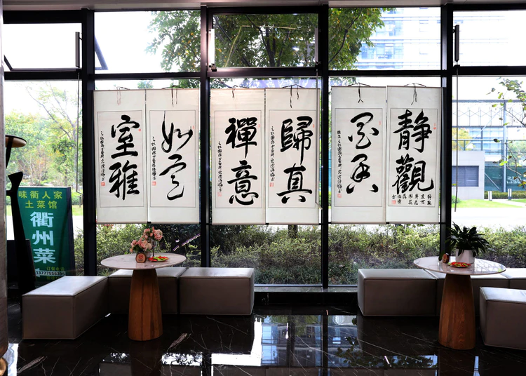 杭州其“江南意象”的精神寄托,也是其商业策划与艺术创作的交汇点。硒和云创写字楼作为创新企业聚集地,暗合其“传统艺术进入现代空间”的理念,让书法艺术走出传统展馆,融入当代人的工作与生活场景,实现了艺术的生活化与普及化。在这里,往来的科创从业者可以近距离感受传统笔墨的魅力,古老文字与现代科技碰撞出独特的文化火花,为快节奏的科创工作注入人文气息,也让传统文化在创新土壤中获得新的生命力。